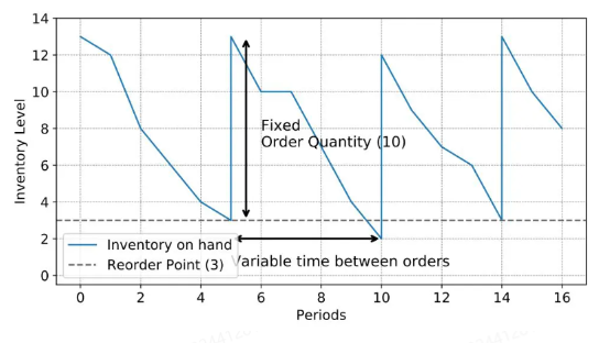 当库存量下降到订货点(R)时,即按预先确定的订购量(Q)发出订货单,经过交货周期(LT),库存量继续下降,到达安全库存量(S)时,收到订货(Q),库存水平上升。