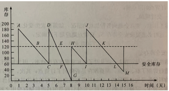 在第3天,总存量下降到120个(点B),到了再订购点。因为从订购到收到货物需2天(LT=2天),在这段时间里,要用掉物料30 x LT=60个。由于在正常情况下不动用安全存量,所以,当总存量为120个时就得补充订货,这意味着订货以后两天,补充订货就到达,不至于动用安全存量。120个单位的补充订货在(C点)到达,总存量立即上升为180个(点D)。