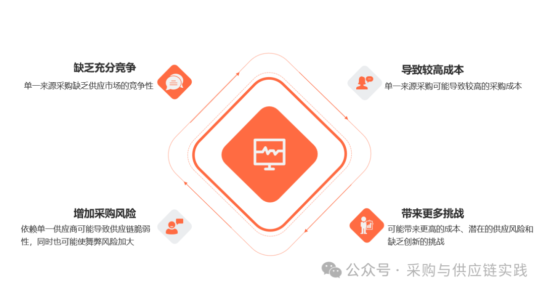 1、缺乏充分竞争:单一来源采购缺乏供应市场的竞争性,意味着采购方直接与一个供应商进行谈判,而非从多个竞标者中选择最优选项。 无竞争性是单一来源采购最显著的特点,因为采购方直接与一个供应商协商,不存在竞争性的招标或者谈判过程。 2、导致较高成本:单一来源采购可能会产生较高的采购成本,因为在没有竞争的情况下,供应商可能不具备降价的动力和动机。 3、增加采购风险:单一来源采购也可能增加采购方的风险,因为依赖单一供应商可能导致供应链会比较脆弱,同时也可能使采购过程中的舞弊风险增大。 4、带来更多挑战:单一来源采购虽然在某些情况下是必要的,但它也可能带来更高的成本、潜在的供应风险和缺乏创新的挑战。 四、单一来源采购的注意事项