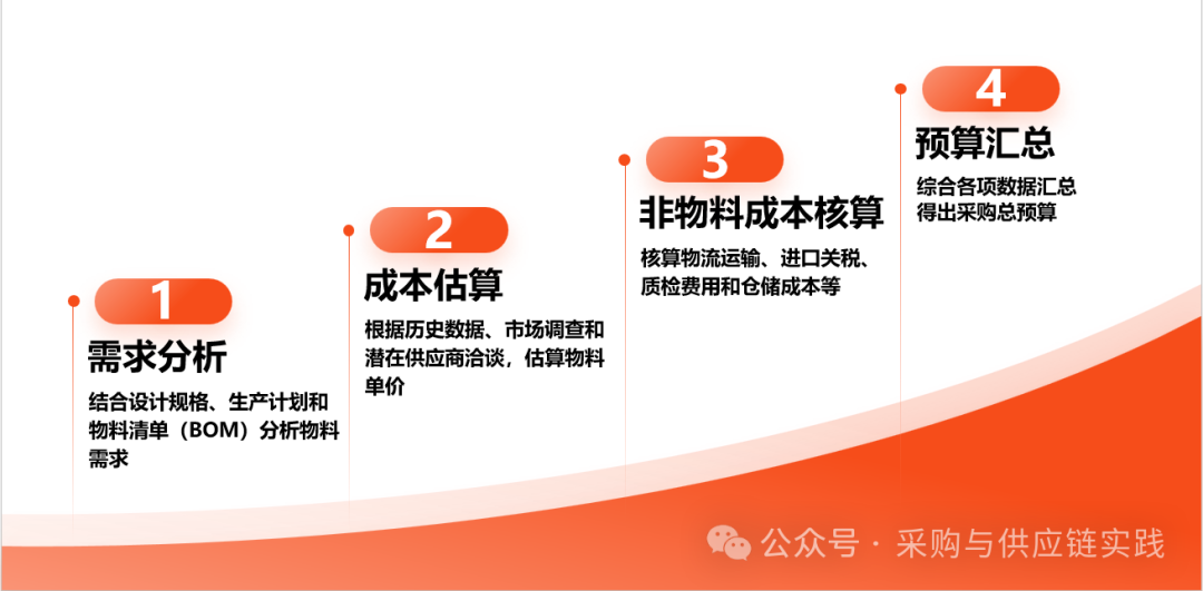 除以上主要步骤外,还有部分配合工作也是编制采购预算时需要进行考虑。比如由财务部门提供上年度采购成本支出、次年度汇率趋势、利率变化预测等各项预算编制基准和参考,生产部门提供上年度产能良率数据、次年度产能计划和设备改造计划等。采购部门根据这些资料,统筹组织进行市场需求分析、产能平衡核算和采购支出预测,最终形成采购预算。