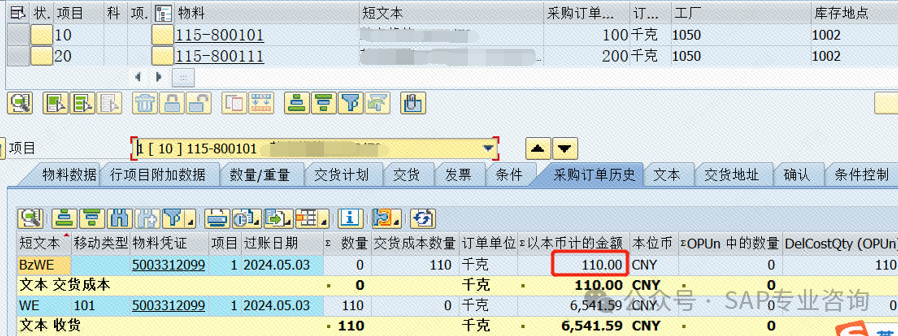 但是收货时候实际到货110千克,按照110千克过账,这个开模费实际也还是付供应商100元,但是系统里面显示是110元。这里 是按照价格条件ZB05的金额100/订单数量100*GR数量110=110, 并不是我们想要的结果固定金额100.然后条件类型里面设置了固定金额,看来还是不起作用。 根据Note 304178 - Absolute conditions in purchasing documents SymptomAbsolute conditions, for example, used at item level in the purchase order item, are calculated down to the item quantity.For the goods receipt, if a quantity differing from the item quantity is posted, this absolute condition is nevertheless quantity-dependent since it is only calculated proportionally. Other TermsDelivery costs, freight costs, freight, absolute value, FRB1 Reason and PrerequisitesFor the goods receipt, the actual posted quantity is not yet available, as far as the program is concerned, at price determination.If the actual posted quantity is available later, the condition technique is not used again for the calculation.Therefore the only option remaining is the proportionalization of the condition values. SolutionNone. 由此得知,这个是SAP标准功能,是按照收货的数量比列来计算对应的费用金额的。 该文章在 2024/7/26 16:46:34 编辑过 |