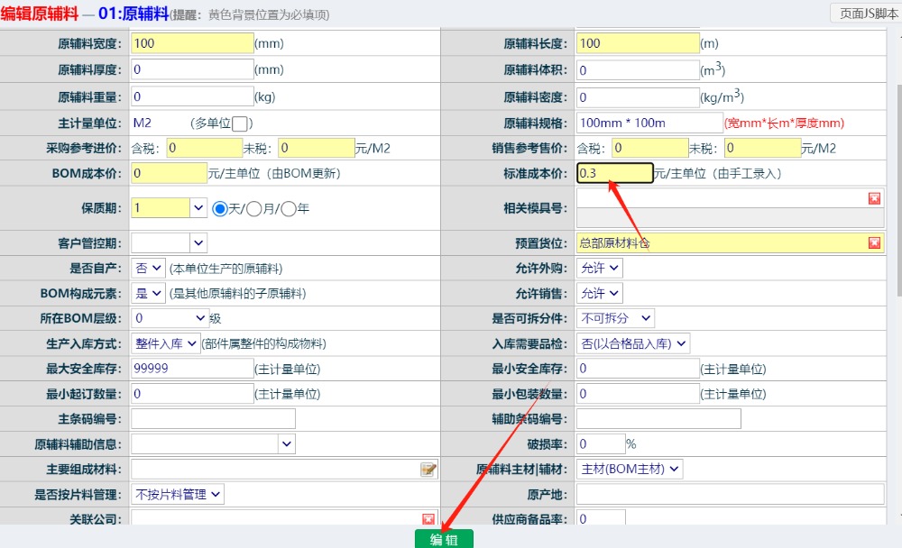 找到标准成本价栏位,填入对应的数值后,点击“编辑”按钮完成,注意,此单价填未税价 ![]() 点晴模切ERP更多信息:http://moqie.clicksun.cn,联系电话:4001861886 该文章在 2024/9/6 15:52:54 编辑过 |