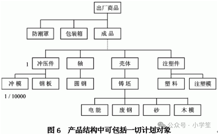 母件同子件的关系可以是一对一,也可以是一对多,但必须是唯一的。如果众多子件中有品种或数量的差异,就应视为另一个不同的单层结构,是不同的母件,应有不同的母件代码。如果子件有多个可选品种,则按模块化产品结构处理,母件是虚拟件(是“白马非马”中的“马”,而不是具体的“白马”。如计算机的泛指“内存”),子件是可选件(具体的白马、黑马……。如计算机的 只有明白产品是由多个单层结构组成的道理,才能处理好“借用件”、“通用件”、“选用件”之间的区别。ERP系统建立物料清单,是从建立一个个反映“单层结构”的“单层物料单”开始的,每项“单层结构”的文件只须建立一次,所有借用这个单层结构的产品就可以共享。系统会根据各单层结构母件同子件的相互关系,自动逐层地把所有相关的单层结构挂接起来,最后形成整个产品的产品结构。 产品结构的层次依产品而异。ERP软件设计可以多到99层,一般不少于25层,但实际应用多在10层以下。层次越多,管理和计划就越复杂,车间定单或加工定单的数量也很庞大。以汽车为例,如果汽车厂要自己生产所有的零部件,产品结构就会层次很多,非常复杂。如果所有的零部件都是外购外协,汽车厂就是一个总装配厂,产品结构就是一种“扁平的结构”;产品结构外协的部分被分散到各个协作厂,成为协作厂的产品结构。如果协作厂对它的零部件也采取外协外包的方式,它的产品结构也将是扁平的,这样的产业链体现了专业化分工给管理带来的好处。这些众多层次的外协外包,构成了一个企业上游供应链,是SCM(供应链管理)或SRM(供应商关系管理)产品的管理对象。各个协作单位发挥各自的特长,共同形成供需链的总体竞争优势。