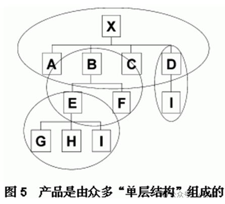 建立物料清单对实施ERP系统来讲,是一项非常繁重的工作,如果能够在CAD和PDM的基础上,直接生成ERP所需要的制造BOM(M-BOM),减少重复劳动,对缩短产品上市周期,快速响应市场变化,都是极其重要的。尤其是单件小批生产的重型矿山机械、汽轮机、船舶等,也就是按定单设计(engineer to order,ETO)类型的机械制造业,企业信息化的步骤如果不是按先上CAD和PDM再上ERP这样的顺序实施,对实施ERP将是十分困难的,甚至会望而却步。如果企业采用了CAD、PDM和ERP系统,但是相互之间不能集成,对企业信息化也将是一个难咽的苦果。 2、建立M-BOM 建立BOM,首先要对它的性质有一个正确的理解。 物料和由物料组成的“单层结构”是产品结构的基本单元。ERP把任何一个产品都看成是由若干个“单层结构”组成的,单层结构中的上层物料,称为“母件(parent)”,下层物料称为“子件(component)”。单层结构就是由一个母件和从属于母件的一个或多个子件组成的。如果对应设计图纸,母件指的是组装图上的装配件,子件是零件明细表中众多的零部件。不少企业在自行开发管理软件时,由于没有“单层结构”的概念,对所有产品的描述都从最顶层一直扎到最底层,相同的“单层结构”在各个产品文件中多次重复出现,数据的冗余量很大,极不合理。 以图5的产品结构为例,X作为最上层的母件是一个要销售出厂的产品,它由A、B、C、D四个子件组成。件X同件A、B、C、D组成一个“单层结构”。件B对应于X来讲是子件,但它对应于件E、F来讲又是母件,并一起组成一个第二个层次的单层结构。同理,件E同件G、H、I;件D同件I又组成位于不同层次的单层结构。任何一个产品都是由这样众多“单层结构”组成的。