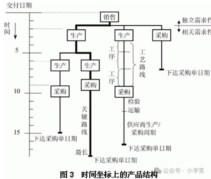 M-BOM首先应用于编制计划,离不开“时间”概念,而E-BOM则无此需求。图2中各个方框之间的连线表明生产或采购周期,长短是不一样的,反映物料生成的过程。根据每一件物料的需求时间倒计时(提前期),求出下达定单或投料的时间,实现“优先级”计划。理想的需求计划是做到“不多不少不早不晚”,也就是准时制生产(JIT)的境界。把产品结构放在时间坐标上,即“时间坐标上的产品结构”,是集成销售-生产-采购三项制造业主要核心业务信息的数据结构模型。见图3。任何一个环节出现例外,在这样集成销产供业务的“一体计划”模型基础上,就能迅速做出调整,快速应变。图3中最长的连线,是关键路线。如果要缩短交货周期,首先要压缩关键路线的长度;选择交货期短的供应商,选择效率高的加工工艺。在其他分支流程上下功夫改进,最多只能降低成本费用,不能缩短总提前期。