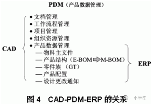 从E-BOM转换为M-BOM通常由PDM来完成(见图4),目前多数的PDM产品,往往偏重于为CAD服务,如果要起到沟通CAD和ERP的作用,需要对上述这些区别有一个比较清楚的概念。
