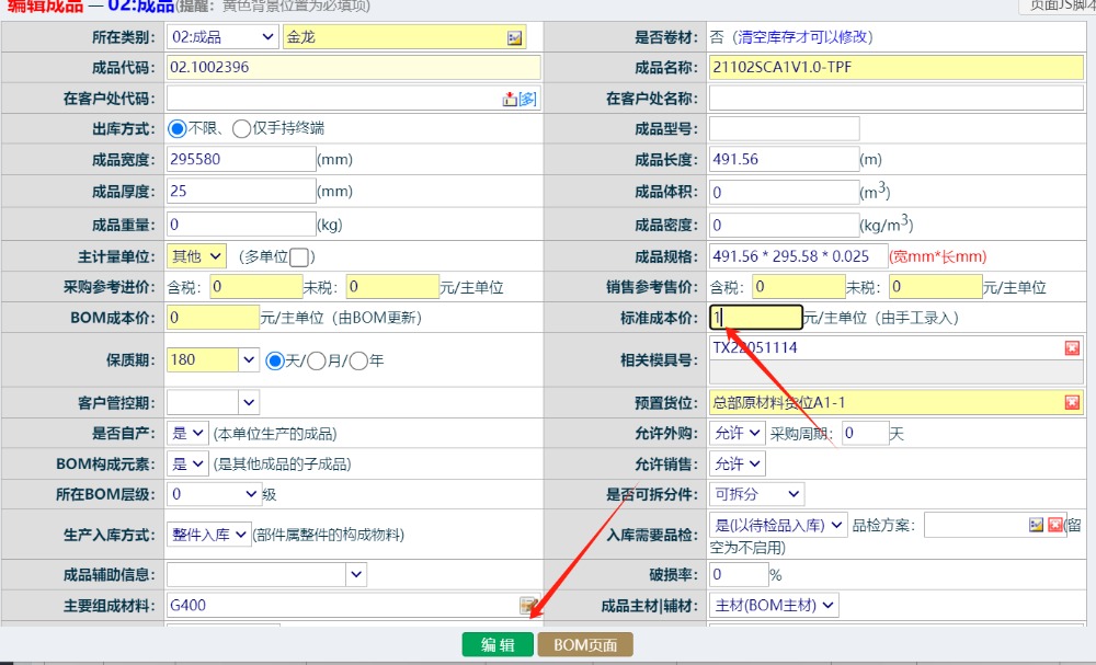 填入标准成本,点击编辑按钮完成,如下图:(注意:若成本需要按生产数量平摊,则成本价统一默认填为1,否则填入真实的标准成本即可) ![]() 点晴模切ERP更多信息:http://moqie.clicksun.cn,联系电话:4001861886 该文章在 2024/10/18 14:21:43 编辑过 |