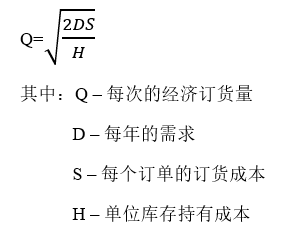 下面是经济订货量的公式。其中Q是我们要计算的经济订货量,即每次订货,综合成本最低的订货量。D是需求预测,注意要转换成每年的量(这里假设每年的需求相对稳定)。S是每次订货的订货成本,这主要是发生在公司内部的成本,比如下订单,跟踪订单,催货,验收,付款等(假定运输等物流成本已经包括到供应商的单价里,如果不是的话,还得加上这些成本)。H是单位库存持有成本,即持有该产品一年的单位成本,包括资金成本、仓储成本、呆滞成本等。