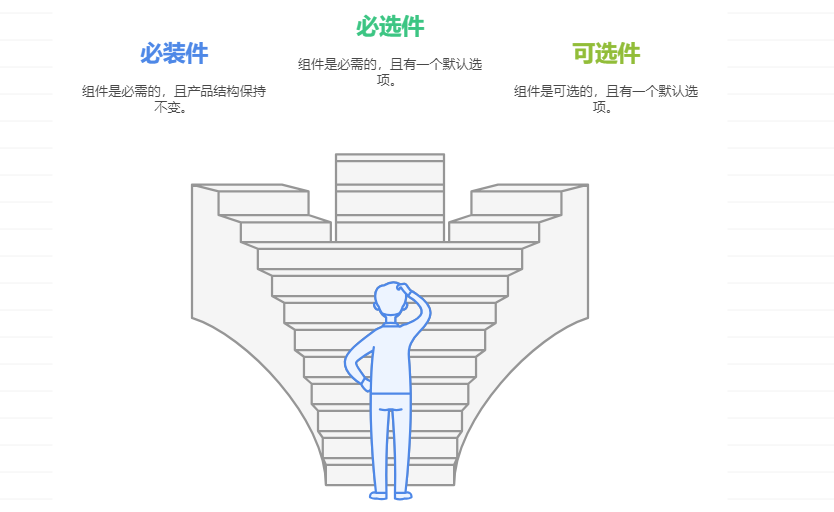 替换件:本产品必须要有的组成部分,一般数量都不变化,例如汽车的发动机。可以有多种选装规格。 选装件:本产品不一定要有的组成部分,可以有多个选装规格。 我个人认为可以分为: 必装件:一定得有,结构不变 必选件:一定得有,默认选一种 可选件:不一定要有,默认选一种 选装件:不一定要有,默认不选 定制件:专为本产品设计新的结构 必装件、必选件、可选件、选装件、定制件可以看做构成企业产品结构的各类零部件的一种装入结构管理属性。计算机应该能够根据一定规则自动完成对有此定义的产品结构的配置管理。