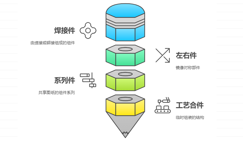 焊接件(结合件):由几个简单零部件焊接或其它方式(铆接)组成的部件。但可能大部分零件不单独出图,和部件共用图纸表达,如果部件图纸不能完全表达清楚零件结构才出相关图纸。很可能没有提供无图下级零部件代号。 左右件:纺机行业术语,指操作工位不同,但镜像对称而共用图纸的两个零部件。 系列件:形成一个系列,共用图纸的一组零部件。往往可以建立尺寸驱动表和具体规格代号对应。标题栏只填名称和代号前半部分。 工艺合件(中间件):在装配过程中需要临时先安装在一起的结构,一般都打破了产品结构对应装配关系。