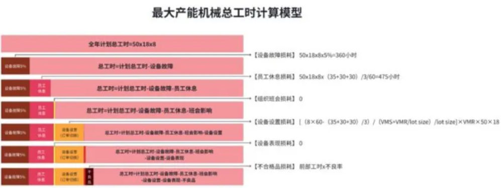 按照上面提到的计划总工时,减去由于设备故障人员休息等造成的多项损耗之后,就可以得到我们想要的可用于计算最大产能的总时长。
