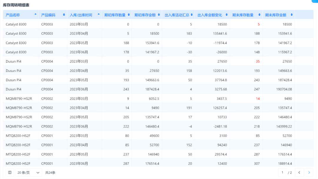 ![]() 4)设置「库存周转率 >> 数据格式」的小数位数为 2: ![]() (3) 产品库存天数 产品库存天数是指将库存周转率换算成具体的天数。 1)添加一个统计表,数据源为刚刚新建的数据流。点击「统计表 >> 数据流」,选择「库存周转率」数据流: ![]() 2)添加计算字段,字段命名为「库存周转天数」,设置公式为365/(销售出库金额/((期初库存金额+期末库存金额)/2)): ![]() 3)图表类型选择「透视表」,添加维度和指标如下: 维度:入库/出库时间、产品名称 指标:库存周转天数(求和) ![]() (4) 其他图表 1)还可以根据业务需求制作其他图表,如当前库存余量,当前库存金额、平均库存周转率等: ![]() 2)详细设置内容和界面配置可在「进销存(标准版)>> 库存管理 >> 库存周转率」处点击「编辑」查看: 库存周转率其实是一个反映你存货管理效率的重要指标。