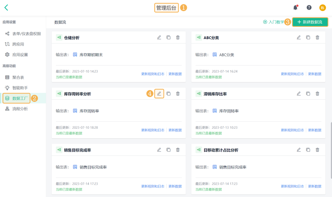 ![]() 1、数据工厂设置 (1) 新建数据流 进入「管理后台 >> 数据工厂」,可在右上角「新建数据流」,或直接点击「库存周转率分析」数据流查看示例内容: ![]() (2)设置输入数据源 添加库存相关表单作为输入节点的数据源,各表单选择字段 ![]() (3) 筛选合格数据 1)在「采购入库」、「其他入库单」、「销售出库」、「其他出库单」四个数据源后添加 数据筛选 节点: ![]() 2)通过入库/出库确认字段,筛选出字段值为「确认」的入库单/出库单。 以采购入库的数据筛选设置为例,添加筛选条件为:「合格品入库确认」等于「确认」;同理,设置其他数据源的数据筛选过滤条件如下: