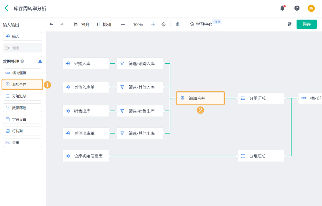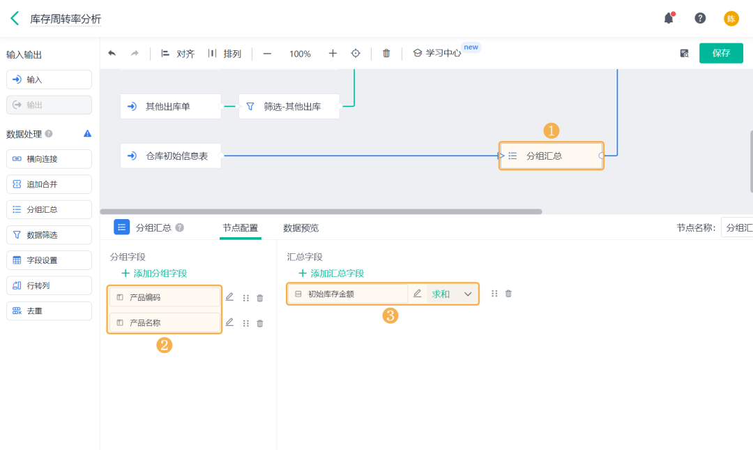 ![]() (4) 合并出入库数据 1)对数据筛选后的 4 张表单数据进行 追加合并,合并为一张表数据: ![]() 2)将不同表单中的出库/入库时间、产品名称、产品编码字段合并,并对各字段进行重命名,具体配置内容如下: ![]() (5) 分组汇总出入库总金额 1)在「追加合并」节点和「仓库初始信息表」后分别添加 分组汇总 节点: ![]() 2)其中,「追加合并」节点后的分组汇总用于计算各产品在不同月份出库/入库总金额: 分组字段:产品名称、产品编码、入库/出库时间(分组方式:「年-月」); 汇总字段:采购入库金额、其他入库金额、销售出库金额、其他出库金额,汇总方式:「求和」。 ![]() 3)「仓库初始信息表」后的分组汇总用于计算仓库中的初始库存金额。 添加「产品编码」、「产品名称」作为分组字段; 添加「产品成本合计」作为汇总字段,汇总方式设置为「求和」,重命名为「初始库存金额」。 ![]() (6) 横向连接 1)对分组汇总后的 2 张表单数据进行 横向连接,连接为一张表数据: ![]() 2)通过「产品编码」字段将两张表单的数据「全连接」为一张表,展示全部库存产品数据: ![]() (7)添加计算字段 在「横向连接」节点后添加 字段设置 节点,添加计算字段,用于计算出入库金额汇总、空仓期末库存金额、期末库存金额、期初库存金额: ![]() 1) 出入库金额汇总 出入库金额汇总是指:全部入库金额相加再去掉全部出库金额。 添加「公式计算」,设置字段名称为「出入库金额汇总」,设置公式为采购入库金额+其他入库金额-销售出库金额-其他出库金额。 ![]() 2) 空仓期末库存金额 空仓期末库存金额是指:对出入库总金额按照出/入库时间进行累加计算。 添加「累加汇总」,设置内容如下: