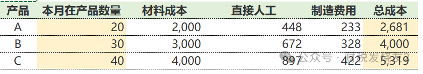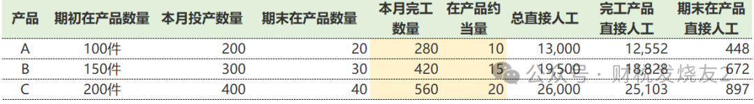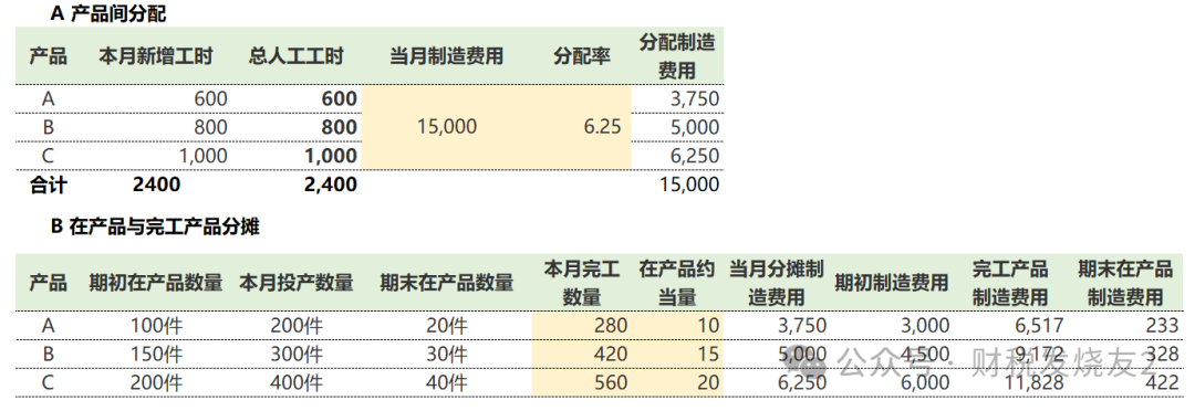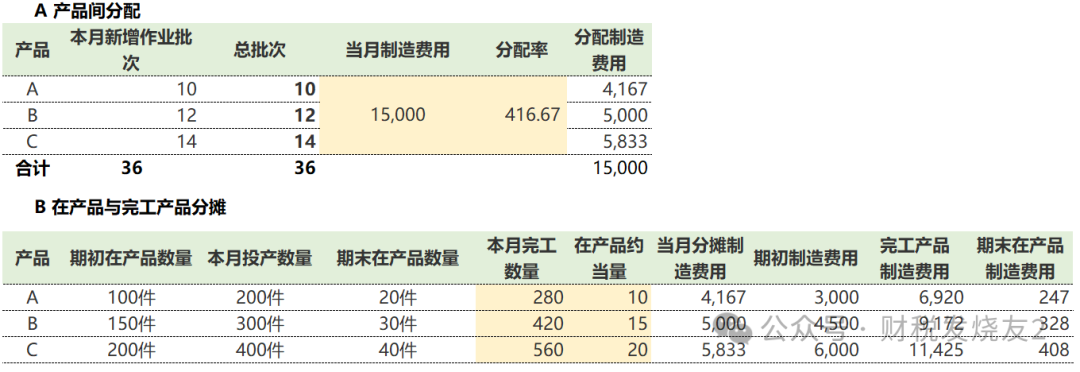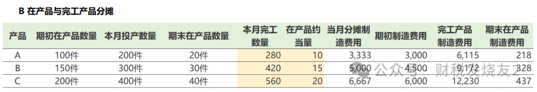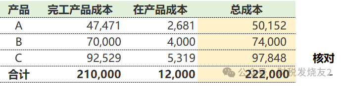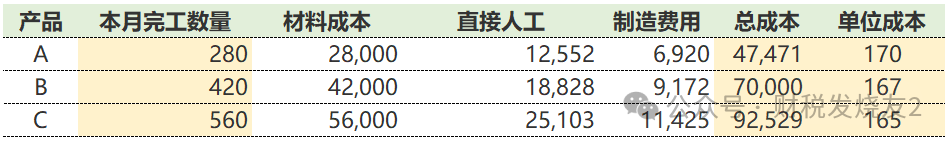 最近很多星友在问成本核算的问题,成本核算是企业财务核算最核心的模块,是财务人通往财务经理/财务总监的"必打之怪"!1、 企业生产3种产品:A、B、C(成本对象),均采用品种法核算。完工程度:材料100%投入,直接人工和制造费用完工程度均为50%。完工程度:材料100%投入,人工和制造费用完工程度50%。因为收集以上数据很难,需要你既要有成本核算知识体系,又要有对公司生产环节、工艺、数据统计等有一个全局的认识和安排!上面背景交代的其实就是【成本归集】的过程,当然也包含【产品产量统计】产品完工产品与在产品数量的统计A产品本月完工数量=期初100+本月投产200-期末20=280A产品总材料成本=期初在产品原料成本10000+本月投产20000=30000A产品本月完工产品的原材料成本=30000×280/300=28000A产品本月在产品的原材料成本=30000-28000=2000A产品本月完工数量=期初100+本月投产200-期末20=280A产品总人工成本=期初在产品人工成本5000+本月投产8000=13000因为直接人工的逐渐投入,且期末在产品的完工程度为50%A产品本月完工产品的原材料成本=13000×280/290=12,552A产品本月在产品的原材料成本=13000-12,552=448制造费用因为与成本对象关联实务中很难寻找,所以制造费用的分摊的合理与否常常对产品成本核算非常重要,特别时制造费用占比很大的公司所以A产品的完工产品制造费用=总制造费用×分配率=(期初制造费用+当月分配的制造费用)×280/(280+10)=(3000+3333)×280/290=6115这里我只选择了一个作业动因即批次,实务中可能会有很多动因我们可以比较以上3种分配制造费用的结果差异,如果差异很大,可能需要慎重分析,不要因为我们核算原因导致成本不准,从而做成错误的经营决策!我们假设选择【按动因分配制造费用】作为最终成本核算方法然后计算完工产品的单位成本=47471/280=170这里分配到完工产品和在产品成本总和与期初在产品成本和本月投入产品成本核对是否一致,不一致需要检查哪里有问题!