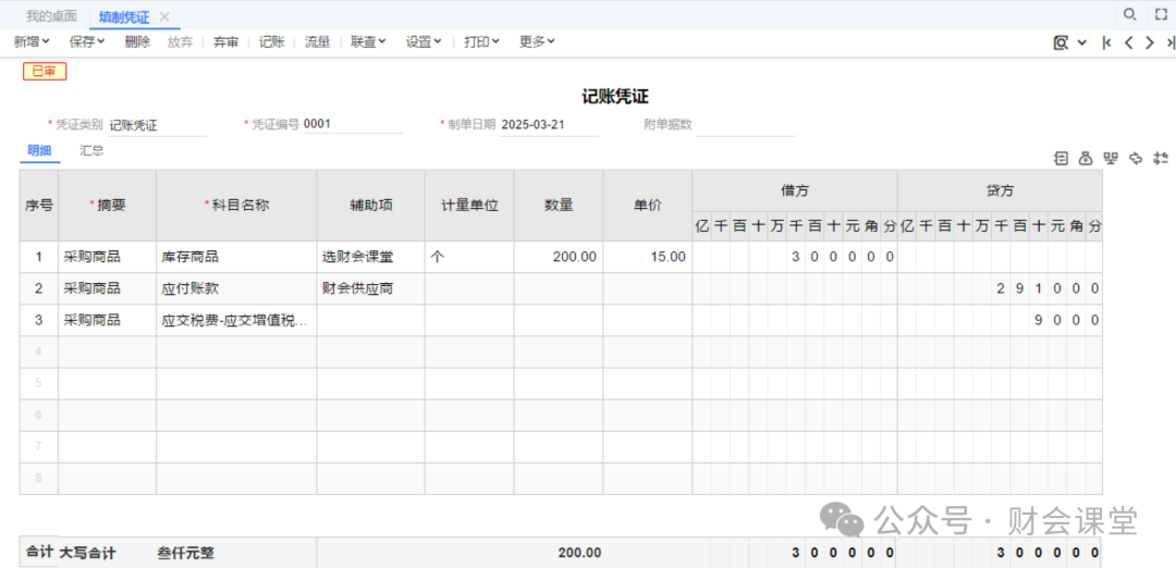 ①2025年3月21日公司从供应商进货商品200件,单价15元,税率3%,未付款