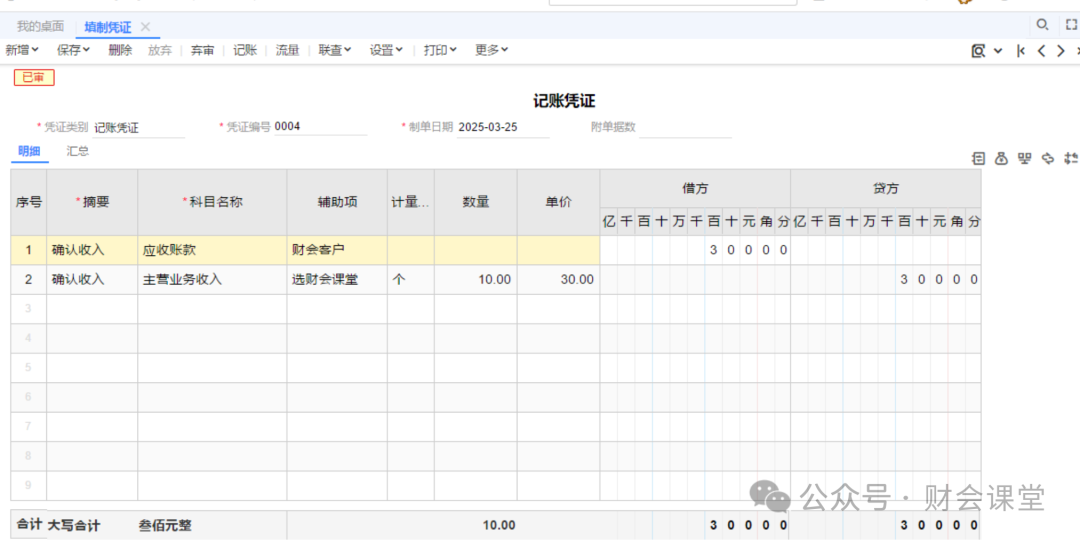 ④三月25日客户购买商品,10件,销售价30元,通过中国银行收款300元