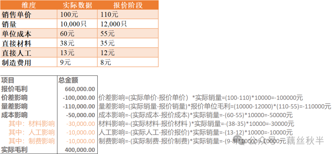 ![]() 💼背景故事: 成本会计福贵刚整理完销售报表,业务部门的领导就把他叫去办公室质问:“A产品怎么回事?报价时不是说能带来66万毛利吗?怎么批量生产后只有40万?” 为了找出毛利缩水的原因,福贵对比了报价阶段和实际生产阶段的数据,深入分析了单价、销量、直接材料、直接人工、制造费用五个维度的变化,最终揭示了问题的根源。📉🔍 📌报价阶段vs.实际数据 ![]() 一、销售单价下降:市场竞争的压力 报价时预期售价为110元,但由于市场竞争激烈,客户无法接受这个价格。经过销售团队谈判,最终单价降至100元,直接减少了毛利10元/只。 📌可能导致单价下降的原因: 二、订单量减少:客户需求的变化 客户最初预测订单量为12,000只,但实际采购量只有10,000只。订单量减少导致固定成本分摊上升,单位成本变高,毛利空间进一步被压缩。 📌可能导致销量下降的原因: 三、直接材料成本上升:调价机制的影响 📌材料成本变化