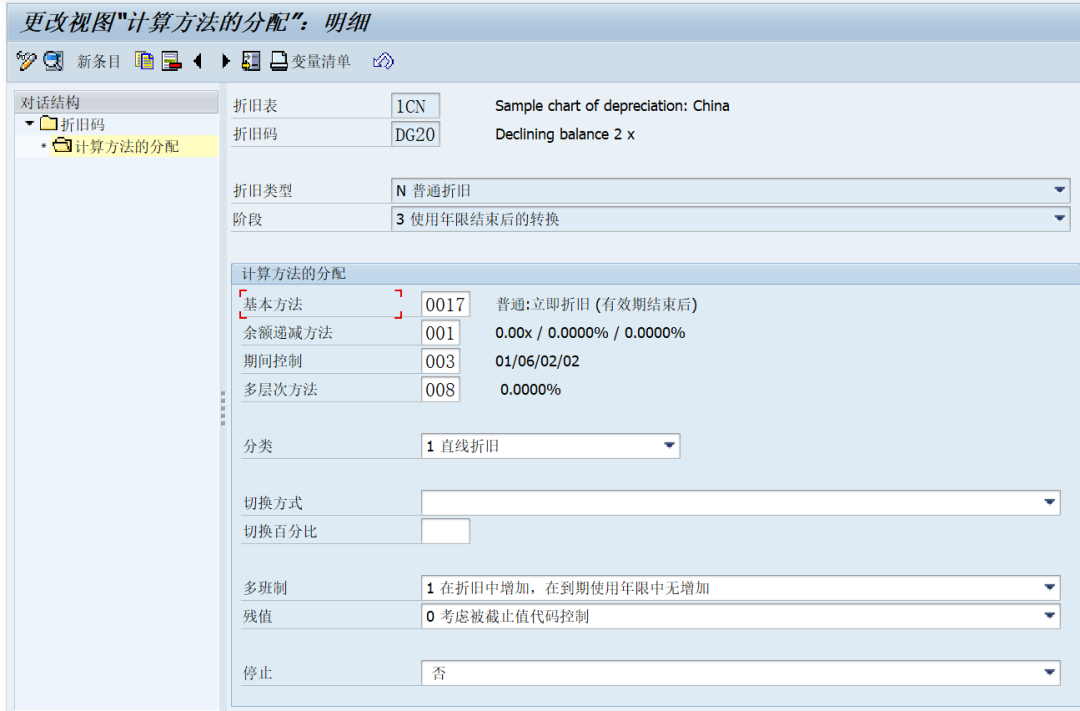 ![]() 备注:新建折旧码可以通过复制现有类似折旧码(如 双击【计算方法分配】切换到计算方法分配下 ![]() 这里可以设置该折旧码的不同折旧阶段(比如,本例设置三个阶段) 阶段1:从折旧开始日开始计算折旧,使用余额递减折旧,当直线折旧法更高时(即使用直线折旧法计算出来的折旧额更高时)切换到下一个阶段。 ![]() 阶段2:在计划使用年限内转换,即当直线折旧法更高时,该折旧码的折旧方法在计划是使用年限内转换为直线法,而在详情页中,我们也可以看到,下一个转换时点为“在使用期结束后进行转换”。 ![]() 阶段3:使用年限结束后转换,即资产使用年限结束后,若还继续使用,则继续使用此处设置的折旧计算方法。 ![]() 可以看到,阶段3仍为直线折旧,切换方式为空(则截止到资产报废,都不会再更换折旧方法)。 最后返回到初始界面激活折旧码 ![]() 点晴模切ERP更多信息:http://moqie.clicksun.cn,联系电话:4001861886 该文章在 2025/4/19 15:04:43 编辑过 |