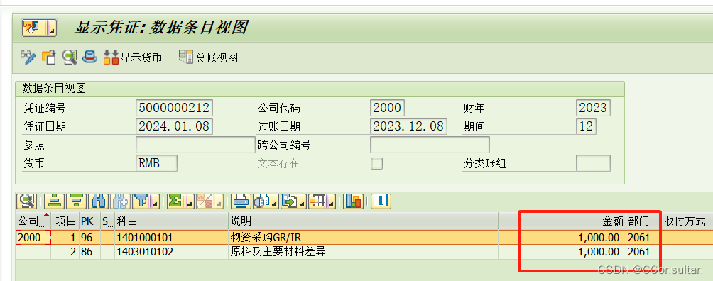 再次查看收货会计凭证,发现收货后更改采购订单单价不影响已收货物料的会计凭证