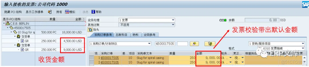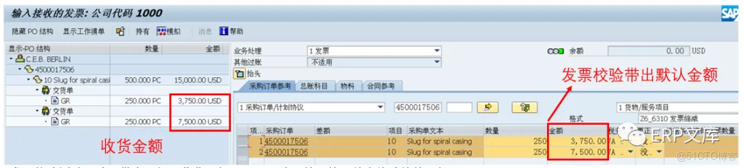 备注:默认带出金额不是收货金额,而是采购订单上的当前净价计算的金额 2.按采购订单收货日期定价 对这采购订单分2批次进行收货,第一次收货,数量250,采购净价15,然后将采购订单净价修改30,第二次收货,数量250,净价30 ,然后做发票校验。
