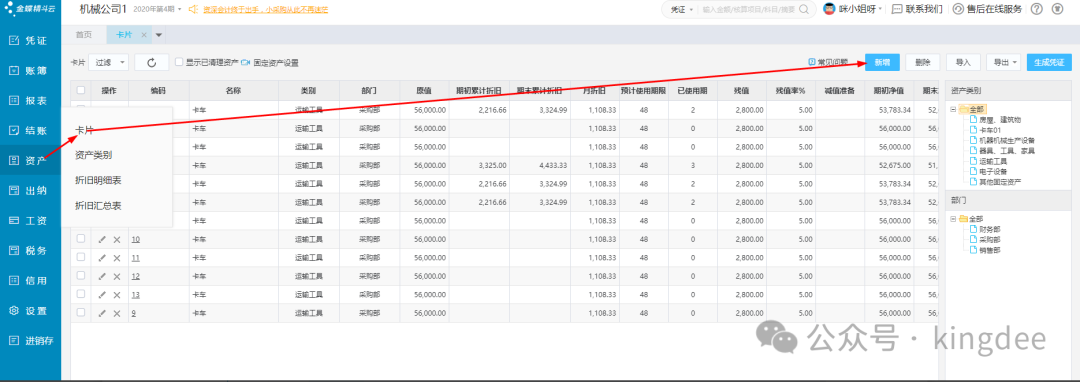 [点晴模切ERP]金蝶精斗云—教你如何使用固定资产模块新增卡片,查询报表?