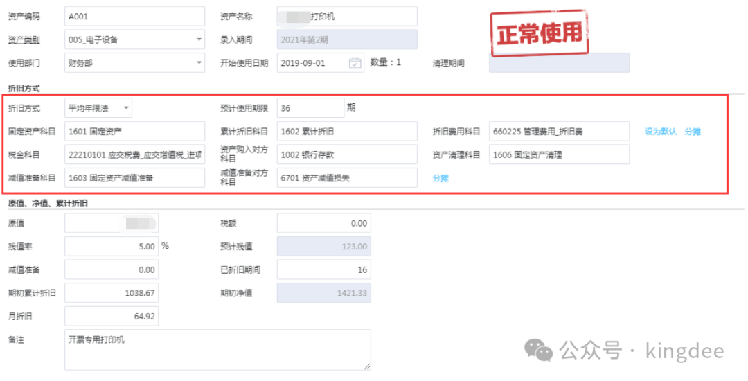 折旧方式: [折旧方式]、 [预计使用期限] 、[固定资产科目]、[累计折旧科目]、[税金科目]、[资产购入对方科目] 、[资产清理科目]、[减值准备科目]、[减值准备对方科目]、[原值]、 [税额]、[残值率]、[预计残值]、 [减值准备]、[已折旧期间]、[期初累计折旧]、[期初净值]、[月折旧]