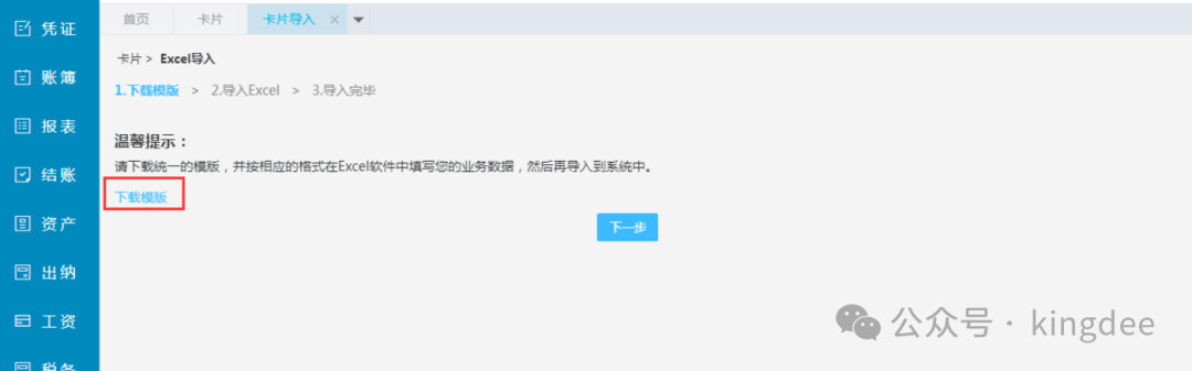 原值、净值、累计折旧: [原值]:即购入资产的总值。 [税额]:即购入资产的含税部分金额。 [残值率]:根据不同的资产类别,残值率不同,可自行修改。 [预计残值]:不可填,等于原值*残值率。 [减值准备]:输入固定资产的减值准备金额。 [已折旧期间]:若开始使用日期早于录入期间,会有已折旧期间值,请填写。 [期初累计折旧]:若开始使用日期早于录入期间,且已计提了累计折旧,请填写。 [期初净值]:不可填,等于原值-期初累计折旧。 [月折旧]:系统会根据以上信息,自动计算出一个数值,计算公式为:(期初净值-预计残值)/(预计使用期限-已折旧期间),也可自行修改。 [备注]:填写备注。 如果卡片较多,还可以通过导入的方式,更加便捷。 点击导入按钮,下载导入模板: