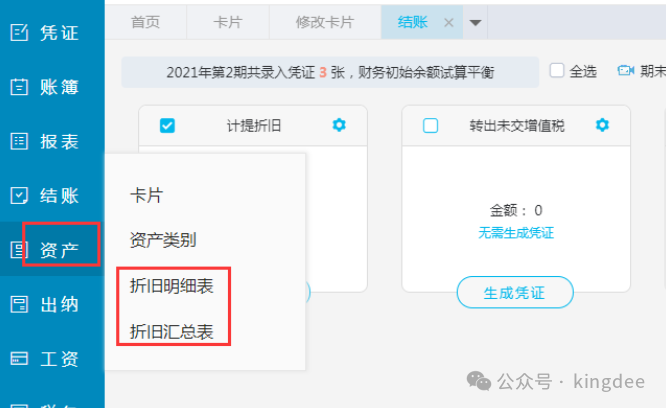 2、固定资产生成凭证 新增卡片时,设置好卡片界面的固定资产、累计折旧、折旧费用、税金、资产购入、资产清理科目,保存卡片后,在卡片列表界面勾选相应卡片即可生成资产购入凭证或清理凭证。(开始使用日期早于录入期间的卡片不再生成资产购入凭证) 填写了减值准备数值的卡片,点击“生成凭证”会自动生成减值准备凭证。 卡片信息维护好,并且当期需要计提折旧,在【结账】页面会出现【计提折旧】,在结账时可一键生成凭证。