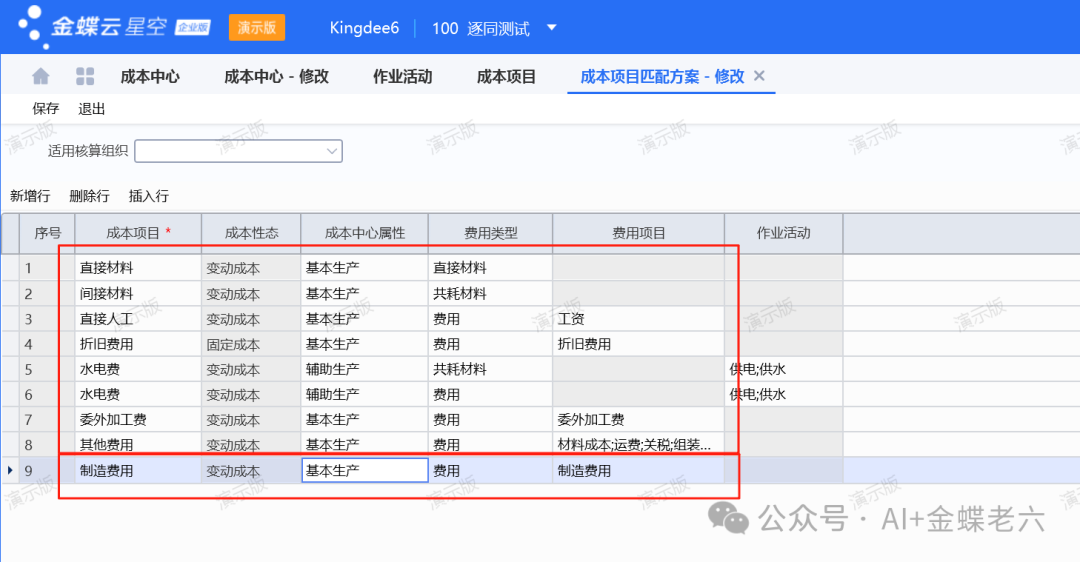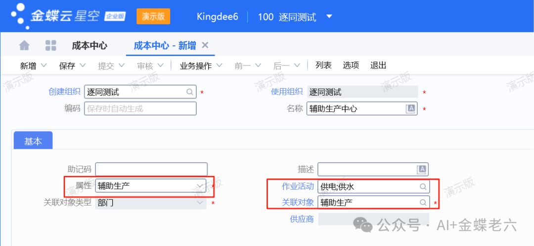 成本中心属性为辅助生产,只能关联部门属性为辅助生产部门的部门,辅助生产成本中心需要关联对应的作业活动如下图所示。
