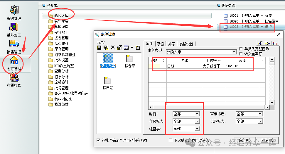 查询时新手们要注意一个点,红蓝字这里要选(全部),之前我查退货单据时老是查询不到,后面才知道是因为这里选了(蓝色),所以用什么条件来查都查不到退货的单据。