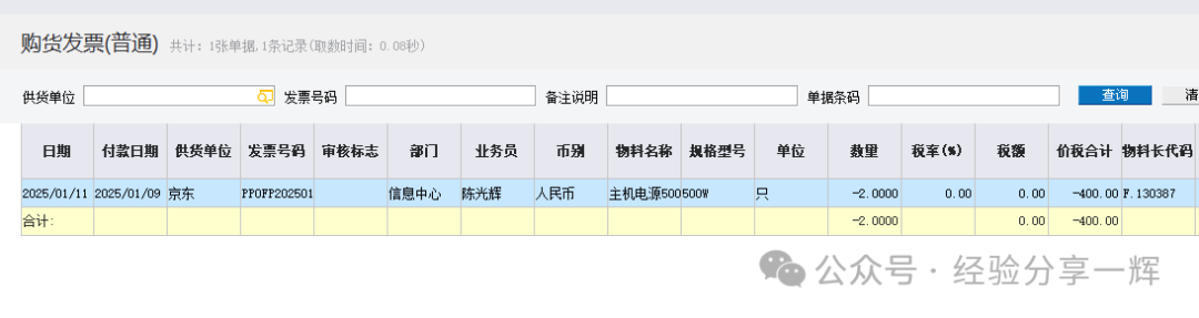 等于是再走一次正常采购入库流程。 (采购入库后退货再入库操作到此结束) 最后注意一点:采购入库后系统生成的(购货发票金额),必须要和(实际的发票)金额一致,如果不一样 ,可修改后,保存,审核。