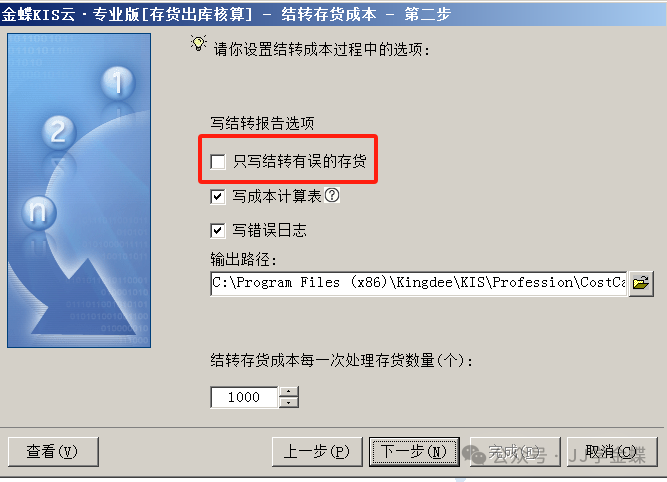 继续点击“下一步”,设置写结转报告选项,物料比较多的情况下建议勾选“只写结转有误的存货”。