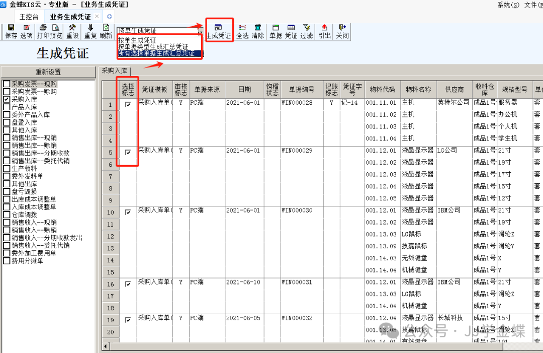 凭证生成步骤:进入业务凭证生成界面,左边选择事务类型,点击“重设”,在弹出的过滤窗口中根据情况筛选出单据,勾选单据并选择单据生成凭证的方式然后点击“生成凭证”。