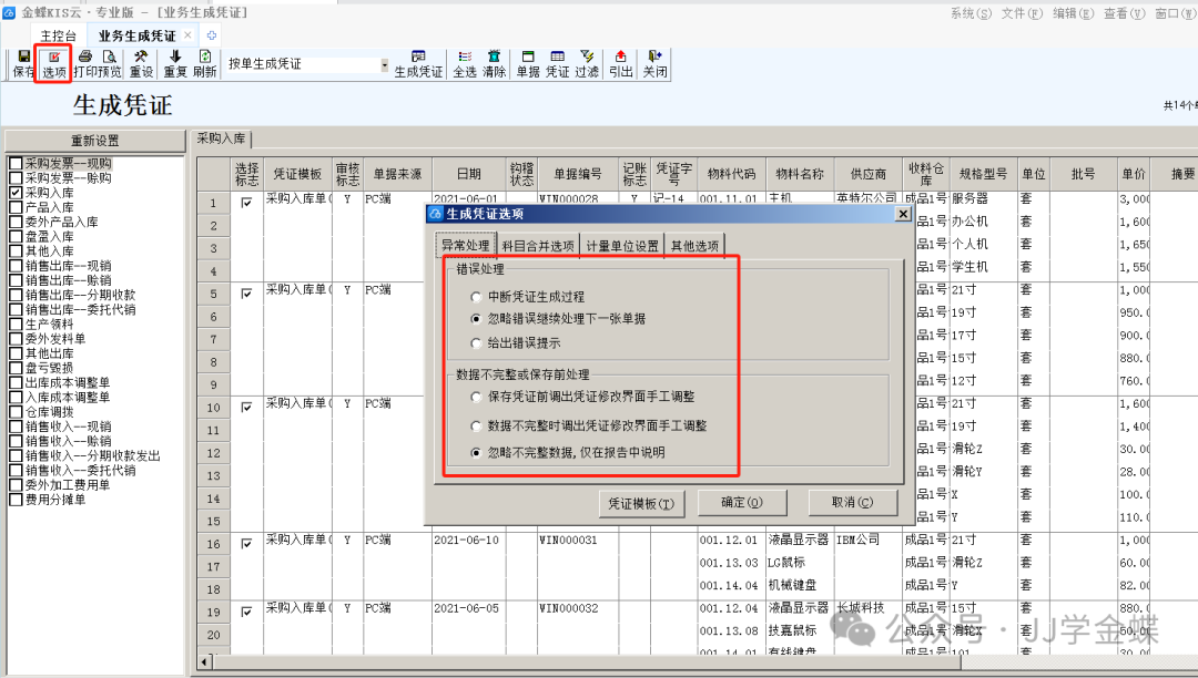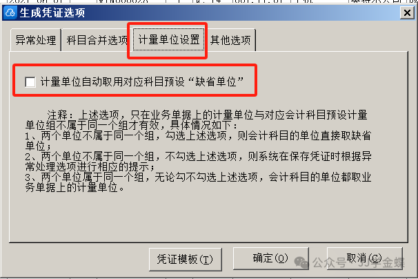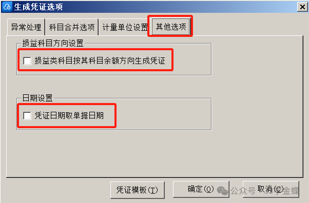 生成失败处理:在生成凭证时,若出现失败的情况,可查看报告。选项中有生成凭证的一些设置,可以设置生成凭证出错时的处理方法以及合并生成凭证的依据。