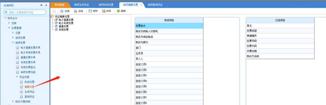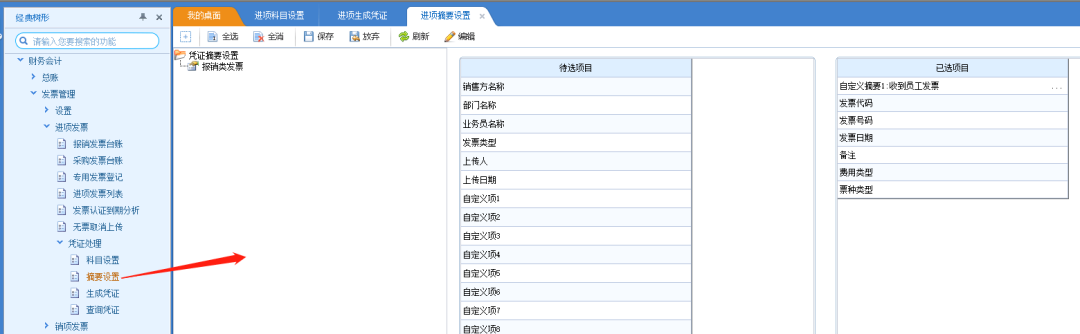 - 摘要设置:通过摘要模板将业务单据信息同步到凭证摘要中。