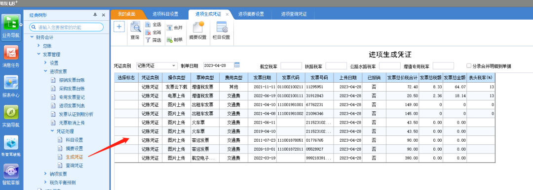 - 税率录入:针对可抵扣增值税专用发票或运输类发票(如航空、铁路票),需在生成凭证界面录入税率,系统自动计算税额。