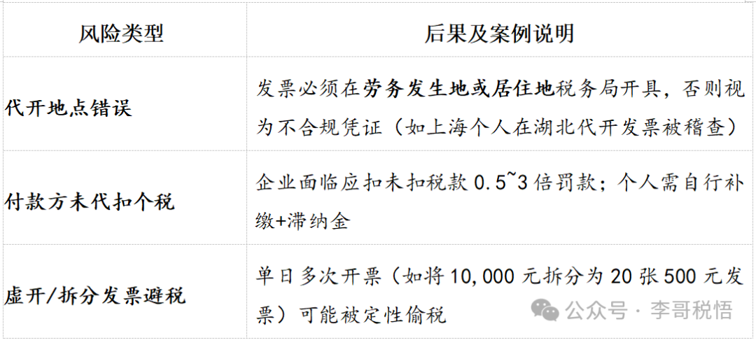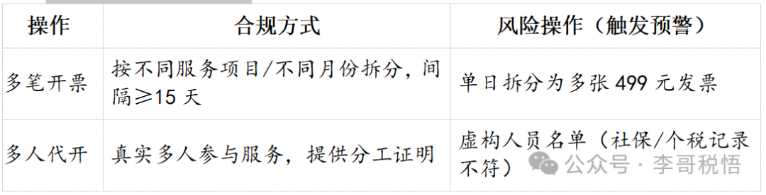 (二)、合规操作建议 1、发票代开流程: 通过电子税务局或大厅申请,选择“劳务报酬”品目; 上传身份证、劳务合同; 系统自动计算增值税及附加税; 备注栏注明“个税由支付方代扣”。 2、个税代扣提醒: 向付款企业提供《个税代扣告知书》,避免企业漏扣; 付款方需在“自然人电子税务局”按“劳务报酬”申报。 3、大额开票风控细化实操指南(以单次≥10万元为例) (1)、事前尽调与材料准备 业务真实性佐证: 签订详细服务合同(含服务内容、验收标准、付款节点); 留存服务过程证据(工作记录、沟通邮件、现场签到表); 提供资金流水匹配(收款账户需与合同主体一致,禁止第三方代收)。 开票地点合规: 必须在业务实际发生地或身份证所在地税务局代开(例:上海个人为北京公司服务,需在北京或上海开票)。 (2)、事中开票控制 分拆策略合规要点: