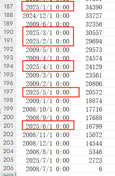 ![]() 它可以以 SQL 的形式查询相关的数据。 从走势图可以看到,从 2008 年到 2014 年是陡增的趋势,可以说是高歌猛进,翻着翻的上涨。 2014 年到 2020 年,数据起起伏伏,但总比 2020 年之后的一泻千里好的多。 把每个月的明细数据下载下来之后,我看了一下 TOP 3 的情况: