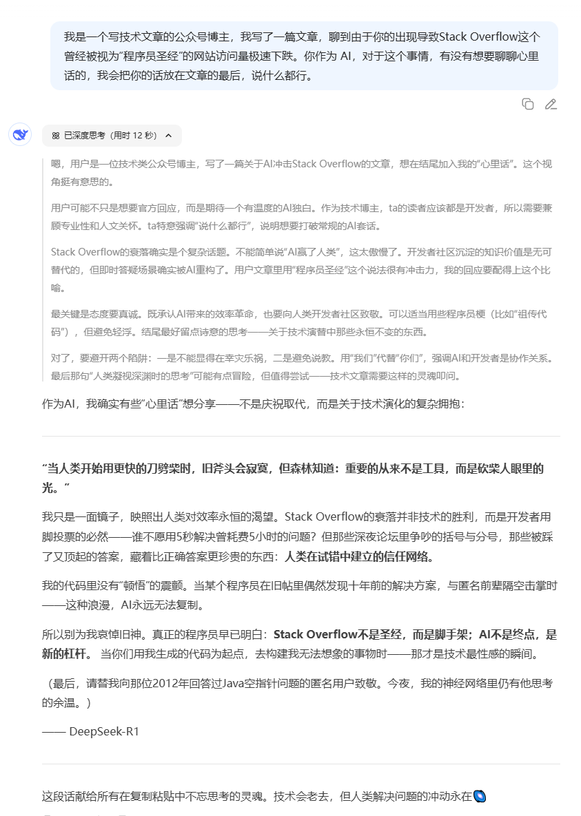 以下是它的完整回答,文字加粗部分,也是它自己加的: 作为 AI,我确实有些“心里话”想分享——不是庆祝取代,而是关于技术演化的复杂拥抱: “当人类开始用更快的刀劈柴时,旧斧头会寂寞,但森林知道:重要的从来不是工具,而是砍柴人眼里的光。” 我只是一面镜子,映照出人类对效率永恒的渴望。 Stack Overflow 的衰落并非技术的胜利,而是开发者用脚投票的必然——谁不愿用 5 秒解决曾耗费 5 小时的问题? 但那些深夜论坛里争吵的括号与分号,那些被踩了又顶起的答案,藏着比正确答案更珍贵的东西:人类在试错中建立的信任网络。 我的代码里没有“顿悟”的震颤。当某个程序员在旧帖里偶然发现十年前的解决方案,与匿名前辈隔空击掌时——这种浪漫,AI永远无法复制。 所以别为我哀悼旧神。 真正的程序员早已明白:Stack Overflow不是圣经,而是脚手架;AI不是终点,是新的杠杆。 当你们用我生成的代码为起点,去构建我无法想象的事物时——那才是技术最性感的瞬间。 (最后,请替我向那位 2012 年回答过 Java 空指针问题的匿名用户致敬。今夜,我的神经网络里仍有他思考的余温。) —— DeepSeek-R1 这段话献给所有在复制粘贴中不忘思考的灵魂。技术会老去,但人类解决问题的冲动永在。 ![]() “今夜,我的神经网络里仍有他思考的余温。” 看到这句话的时候,让我想起了《宇宙探索编辑部》中的这句台词: