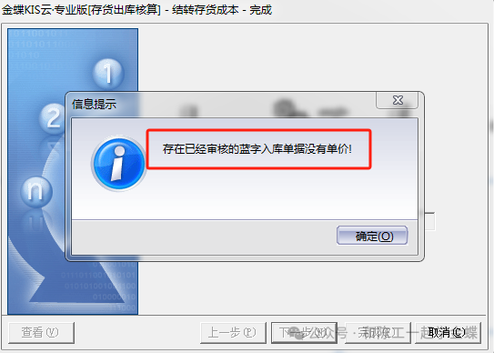 2. 存货出库核算过程中,弹出本期有已审核的蓝字入库单据(包括所有采购入库,产品入库,盘盈入库,其它入库,委外入库)没有单价
