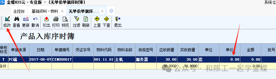单据都审核了,难道要反审核去修改吗?入库的也可能已经出库了,那么怎么处理呢?不要慌,系统提供了一个专供财务使用的功能,在存货核算右边的无单价单据序时簿,在这里不需要反审核,就可以直接修改单价