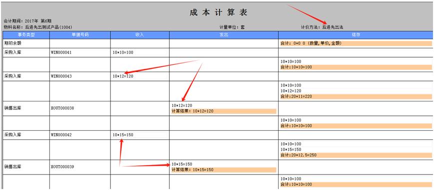 4.后进先出法 4.1 计算方式:出库成本单价=按单据日期的最后入库的先发出, 4.2 计算结果:5号的出库成本取2号的入库成本12块,15号的出库成本取10号的入库成本15块