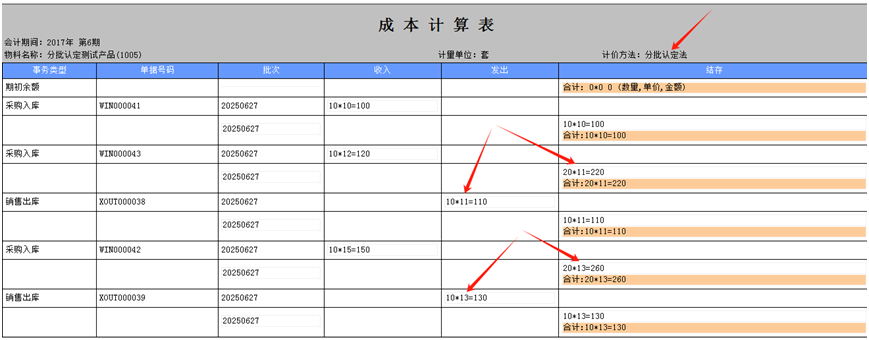 5.分批认定法: 5.1计算公式:出库成本单价=同一批次(期初金额+本次出库前收入金额)/(期初数量+本次出库前收入数量) 5.2 计算结果:6.5号的出库取1号2号的加权平均成本11块,6.15号的出库取10号的结存金额和10号的加权平均单价13块