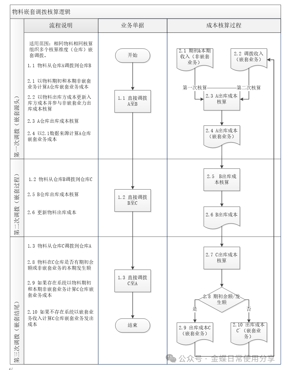 通过这个案例我们可以看出,A、C仓库核算调拨单出库成本时计算逻辑与正常业务不一致,主要原因A、C仓库存货核算时部分业务单据存在嵌套。系统计算时先找到嵌套源头,第一次出库成本核算时不包含嵌套单据收入直接计算嵌套单据出库成本,第二次计算时加入嵌套单据收入计算存货出库成本并更新其他业务单据的出库成本;针对嵌套结束单据系统第一次计算时如果物料存在期初或其他非嵌套业务单据的收入,系统以这两种业务的收入按存货核算方法计算嵌套业务单据的出库成本,如果当期没有期初或其他非嵌套业务单据系统取本期嵌套业务单据的收入,计算嵌套业务单据的出库成本。