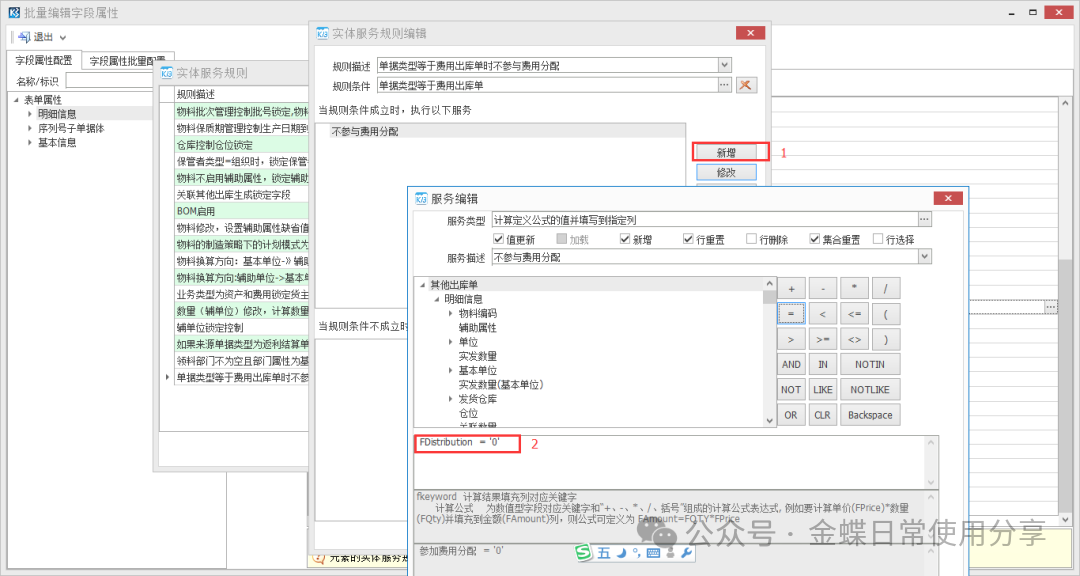 2.打开BOS新增“其他出库单”“明细信息”的“实体服务规则”,我这里新增“单据类型等于费用出库单时不参与费用分配”实体服务规则。