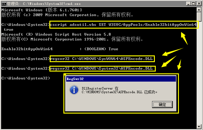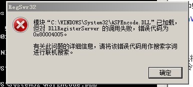 解决方法:先将上面下载组件中的压缩包打开,将压缩包中的文件“ASPEncode.DLL”复制到目录“C:\WINDOWS\SYSTEM32\”中,然后用管理员模式运行C:\WINDOWS\SYSTEM32\CMD.EXE,手工输入组件注册命令:“regsvr32 /s ASPEncode.DLL”和“regsvr32 /s %windir%\system32\ASPEncode.DLL”,即可解决。