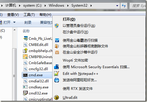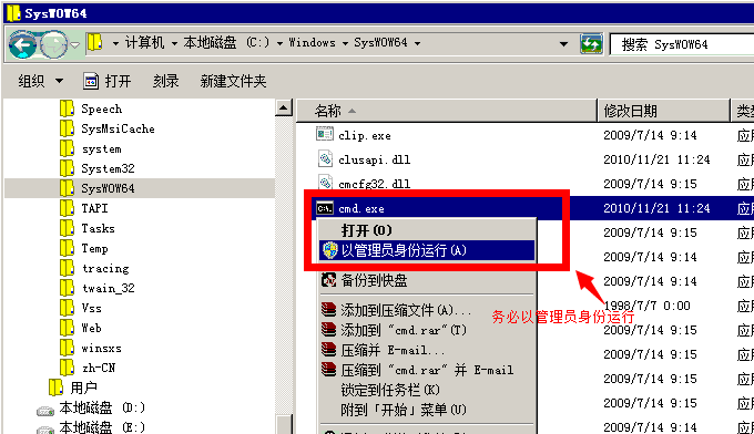 4、然后用管理员模式运行 C:\WINDOWS\SysWOW64\CMD.EXE 或 C:\WINDOWS\SYSTEM32\CMD.EXE ,在弹出的CMD窗口中输入运行: