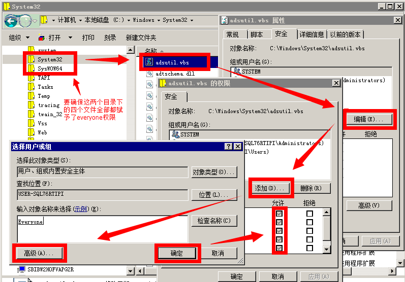 3、将下载组件 和附件:adsutil.rar 中的压缩包打开,以管理员身份将两个压缩包中的文件“ASPEncode.DLL”和“adsutil.vbs”复制到目录 C:\WINDOWS\SysWOW64 和 C:\WINDOWS\System32 这两个目录中,并将以下四个文件及目录temp全部赋予everyone的访问权限: