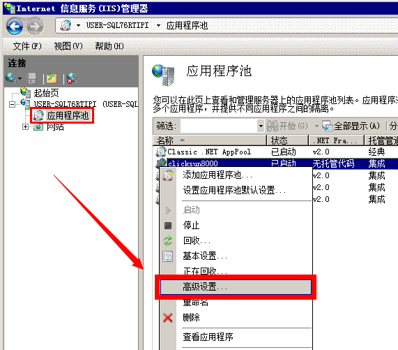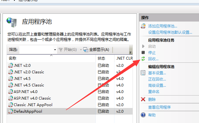 找到点晴MIS系统所用的应用程序池,一般为:DefaultAPPPool,如果自己更改过,也可能是clicksun之类的